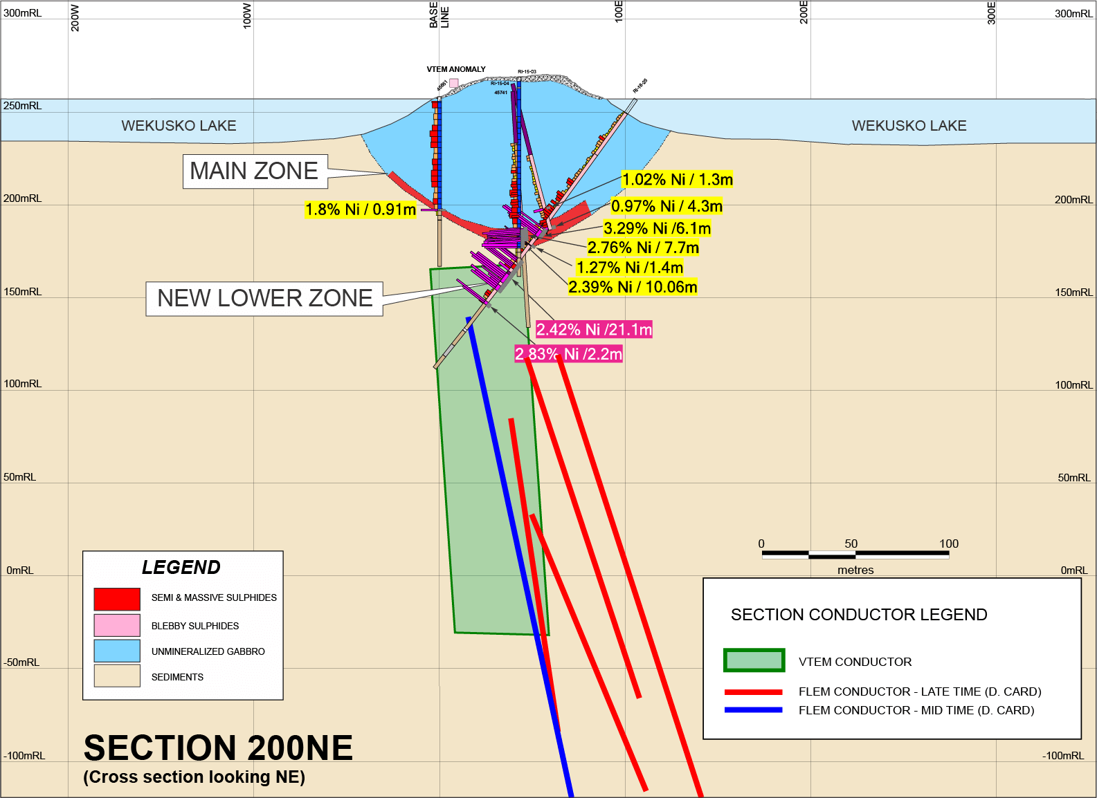 The Rice Island nickel-copper-cobalt deposit was explored by drill programs completed by Inco Ltd. (1949-1950 and 1967). Inco’s historic drilling included intercepts of 2.63% Ni, 0.98% Cu over 10.30 metres, 2.39% Ni, 1.24% Cu over 10.06 metres, 1.02% Ni, 0.85% Cu over 35.57 metres, 1.03% Ni, 0.50% Cu over 22.86 metres, 4.31% Ni, 1.28% Cu over 5.18 metres and 3.20% Ni, 1.23% Cu across 5.95 metres.